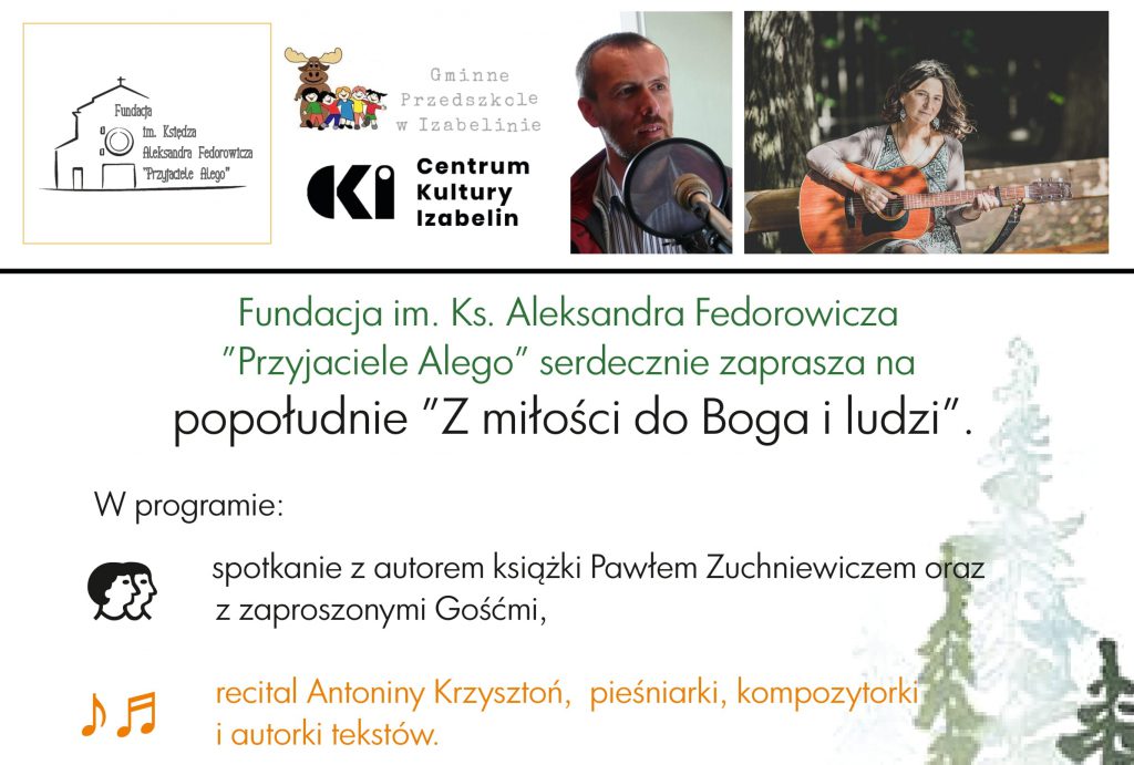 “Z miłości do Boga i ludzi” – 26.06.2021, godz. 16, “Pod Sosnami” Fundacja "Przyjaciele Alego" 5 lat ago “Jest cisza”. Śpiew: Antonina Krzysztoń. Słowa: Ks. Aleksander Fedorowicz https://www.przyjacielealego.pl/wp-content/uploads/2019/04/Antoni_Krzyszton_Cisza.mp3?_=1